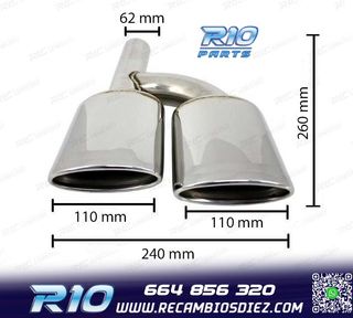 Móvil: 664 856 320 - Referencia: ESC000291. COLA ESCAPE DOBLE RECTANGULAR ACERO INOX Especificaciones: Modelo: Doble rectangular Material: Acero inoxidable. Medida: 240mm (largo), 190mm (ancho),70(alto) Diámetro de entrada: 60mm. Montaje. Instalación sencilla, sujección mediante tornillo o punto de soldadura. Imagen. Dale un toque más deportivo al vehículo con esta cola de escape.