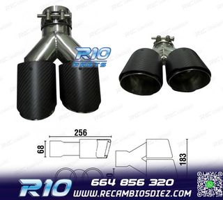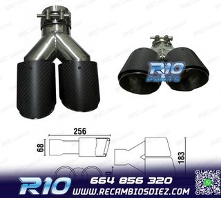 Móvil: 664 856 320 - Referencia: ESC010100. COLA ESCAPE CARBONO DOBLE DERECHA Medidas: Diámetro de entrada interior 68 mm, exterior 70 mm Diámetro de salida interior 80 mm, exterior 90 mm Largo del lado izquierdo de 256 mm Largo del lado derecho de 239 mm Instalación sencilla, sujección mediante tornillo o punto de soldadura Imagen. Dale un toque más deportivo al vehículo con esta cola de escape.