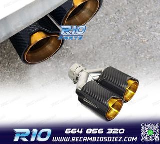 Móvil: 664 856 320 - Referencia: ESC010121. COLA ESCAPE IZQ BMW LOOK M PERFORMANCE DORADO CARBONO Especificaciones: Modelo: Look M Performance Lado de montaje: Izquierdo Tipo de salida: Doble Color: Dorado / Carbono Diámetro de entrada: Interior: 60 mm Exterior: 64 mm Diámetro cada salida exterior: 94mm Largo: 250 mm Ancho total: 192 mm Montaje. Fácil instalación sin modificar nada en el vehículo. Kit completo. Incluye las 2 colas de escape listas para instalar. Estos no son productos originales de la marca BMW. El artículo ofrecido, solo es compatible para los modelos de v