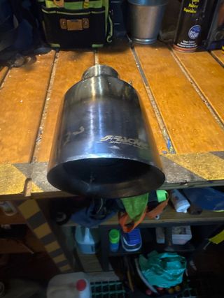 Cola de escape de metal pulido con logo. - Diseño cónico. - Acabado brillante.