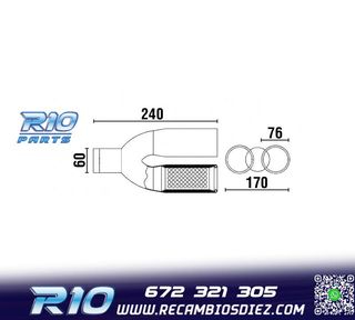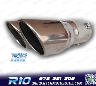 Móvil: 672 321 305 - Referencia: ESC000316. COLA ESCAPE DOBLE REDONDA Especificaciones: Modelo: Doble redonda Material: Acero inoxidable Medida: 240 mm (largo) 170 mm (ancho) Diámetro de entrada: 60 mm Montaje. Instalación sencilla, sujección mediante tornillo o punto de soldadura Imagen. Dale un toque más deportivo al vehículo con esta cola de escape