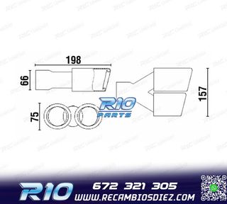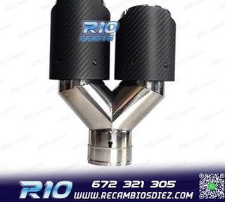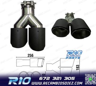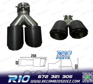 Móvil: 672 321 305 - Referencia: ESC010100. COLA ESCAPE CARBONO DOBLE DERECHA Medidas: Diámetro de entrada interior 68 mm, exterior 70 mm Diámetro de salida interior 80 mm, exterior 90 mm Largo del lado izquierdo de 256 mm Largo del lado derecho de 239 mm Instalación sencilla, sujección mediante tornillo o punto de soldadura Imagen. Dale un toque más deportivo al vehículo con esta cola de escape.