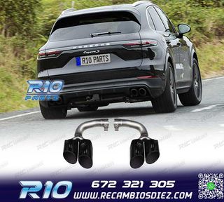 Móvil: 672 321 305 - Referencia: ESC010133. COLAS ESCAPE PORSCHE CAYENNE 17- LOOK S NEGRO Válido para: Porsche Cayenne 9Y0 SUV 3.0 (2017-) No valido para: Porsche Cayenne S Porsche Cayenne Turbo / Turbo S Porsche Cayenne GTS Dimensiones: Diametro de salida: 6,5 cm Largo: 36 cm Ancho: 22 cm Alto: 12,5 cm Especificaciones: Modelo: Look S Tipo de salida: Doble a ambos lados Color: Negro Montaje. Fácil instalación sin modificar nada en el vehículo. Kit completo. Incluye las 2 colas de escape listas para instalar. Estos no son productos originales de la marca PORSCHE. El art?