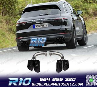Móvil: 664 856 320 - Referencia: ESC010133. COLAS ESCAPE PORSCHE CAYENNE 17- LOOK S NEGRO Válido para: Porsche Cayenne 9Y0 SUV 3.0 (2017-) No valido para: Porsche Cayenne S Porsche Cayenne Turbo / Turbo S Porsche Cayenne GTS Dimensiones: Diametro de salida: 6,5 cm Largo: 36 cm Ancho: 22 cm Alto: 12,5 cm Especificaciones: Modelo: Look S Tipo de salida: Doble a ambos lados Color: Negro Montaje. Fácil instalación sin modificar nada en el vehículo. Kit completo. Incluye las 2 colas de escape listas para instalar. Estos no son productos originales de la marca PORSCHE. El art?