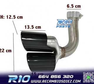 REF: EL000043 DESCRIPCION: Kit compuesto por dos colas tipo RS4 / CUPRA / RS6 Para montaje en ambos lados del vehículo, izquierda y derecha. Acero inoxidable. Fijación: tornillo / soldadura. Diámetro de entrada: 58 int. / 60 ext. mm. Diámetro de salida: 155x96 mm. Lado más largo: 200 mm. Lado más corto: 170 mm. Acabado en salida inclinada. Color negras satinadas. KIT COLAS DE ESCAPE TIPO RS4 / RS6 IZQUIERDA Y DERECHA NEGRAS