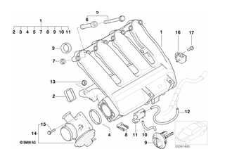 Colectores de admisión originales para BMW. - Referencia: 11617800577. - Componentes incluidos: 1, 2, 3, 4, 6, 7, 8, 9, 10, 11, 12, 13, 14, 15, 16, 17.