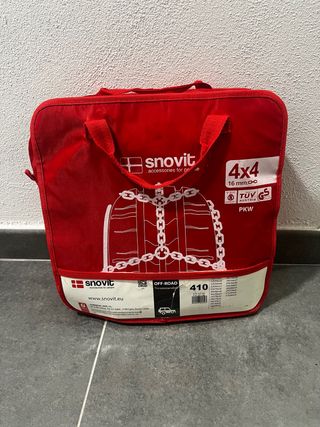 Cadenas para nieve Snovit, modelo 4x4 de 16 mm. - Incluye bolsa de transporte roja. - Homologación TUV Austria. - Apto para neumáticos Off-Road. - Referencia 410.