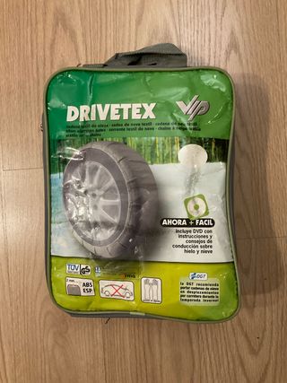 Cadenas textiles para la nieve de la marca DRIVETEX. - Incluye DVD con instrucciones y consejos. - Certificación TUV GS. - Compatible con ABS y ESP. - Incluye guantes de algodón.