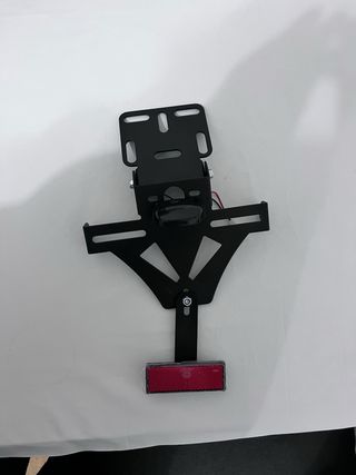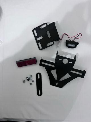 Porta matrícula para moto, sin uso. Lo compré pero nunca lo llegué a montar. Incluye todos los accesorios de montaje (tornillería, soporte, luz de matrícula y reflector). Fabricado en metal, acabado negro. Válido para la mayoría de motos (anclajes ranurados universales).