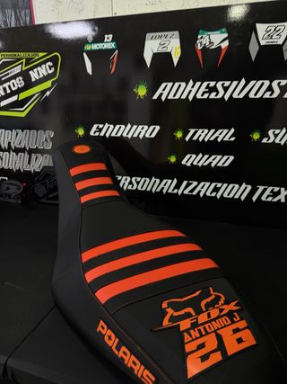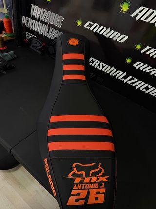 Tapizado personalizado para Polaris Predator con diseño Fox y detalles en naranja. - Tapizado personalizado de Fox. - CON TU NOMBRE - TU NUMERO - Costuras en contraste naranja. - Logo de Polaris. - Rayas naranjas en el asiento, o colores del asiento a elegir a tu gusto, totalmente personalizado. Para mas informacion 669015226