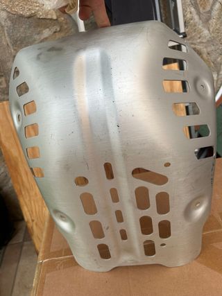 Pieza frontal para moto clásica. Estaba montada en una dnepr de 1969 aunque parece más moderna. Fabricada en metal y pantalla de plástico transparente. - Mide 90cm de ancho y 48cm de alto (con la pantalla la altura total es de 90cm). - El orificio es para un foco de 20cm de diámetro