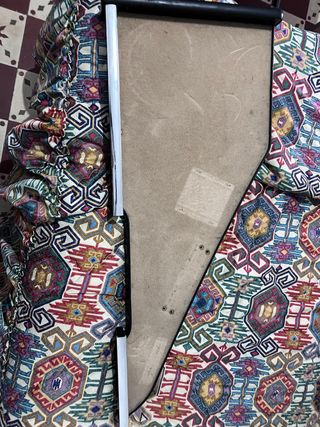 Mesa auxiliar con diseño inspirado en camiones Mercedes. - Estructura de madera. - Funda de tela con estampado geométrico.