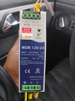 Fuente de alimentación de carril DIN de la marca MEAN WELL, modelo WDR-120-24. - Entrada: 200-500VAC, 1.4A. - Salida: 24V, 5A. - Fabricado en Taiwán.
