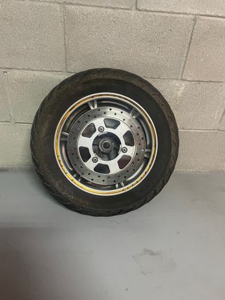 Rueda trasera de moto completa con disco de freno. •Suzuki Burgman 125 •Modelo 2007-2013 •(Año 2011) •Goma al 55 % - Llanta de aleación. - Neumático en buen estado. - Disco de freno incluido.