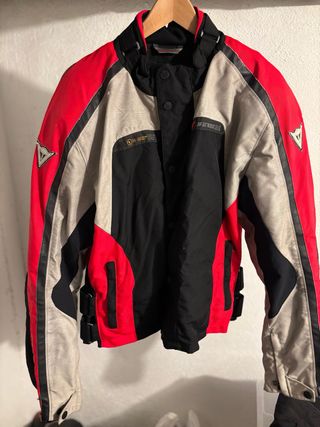 Mono Dainese de cordura en colores negro y rojo. Diseño deportivo y resistente. - Material de cordura. -Forro interior de chaqueta y pantalón. - Combinación de colores negro y rojo. Talla chaqueta 54 Talla pantalón 52
