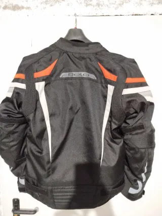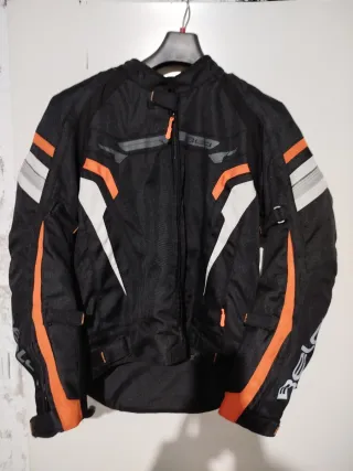 Chaqueta de moto con diseño moderno y detalles en naranja. Usada en un par de ocasiones - Color principal negro. - Detalles de diseño en color naranja. - Cierre frontal con cremallera. - Mangas con bandas reflectantes. Forro interior térmico desmontable Bolsillos impermeables Protecciones en codos y hombros Cuello en neopreno para evitar roces Talla xl