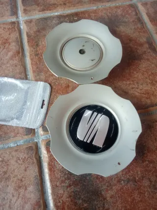Dos tapas para llantas de Seat Toledo. Son de color plateado y negro con el logo de Seat. - Set de 2 tapas para llantas. - Logo de Seat en el centro.