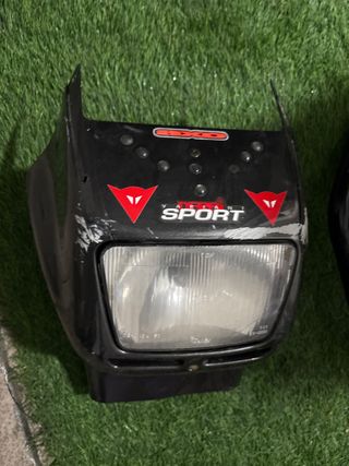 Careta delantera para Derbi Variant Sport en color negro. Presenta un diseño deportivo con detalles gráficos. - Incluye el faro delantero. - Logos de Dainese y Sport visibles. - Adhesivo AXO en la parte superior.
