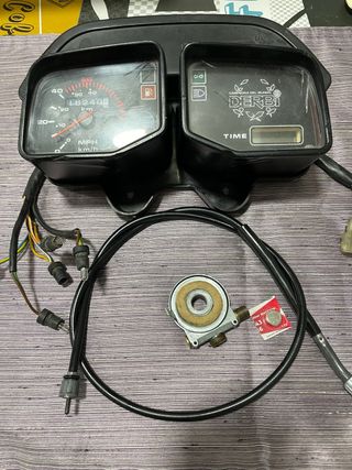 Kit de velocímetro para Derbi FDS Savannah Super FDS Ultimos modelos de FDS Incluye el cuadro de instrumentos con reloj funcionando y pila nueva. Cristales y carcasa dañados ver fotos Reenvío , cable, y funda sirga en perfecto estado limpio y engrasado. Cables de iluminación del cuadro con regletas de serie y bombillas. Todo original , Comprobado funcionando Muy difícil de encontrar No se vende por separado. Al tener una FDS mas antigua no se adapta al foco. Exclusivo para Savannah. - Indicadores de combustible y luces. - Cable de velocímetro. - Mecanismo de cuenta kilómetros. Sabana Cuentakilómetros Rabasa Derbi FDS SUPER sirga