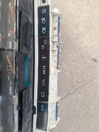 Cuadro de instrumentos para Seat Marbella. Incluye velocímetro y testigos. - Velocímetro hasta 160 km/h. - Indicadores de combustible, aceite, temperatura, luces y batería. - Botones de control y rejilla de ventilación.