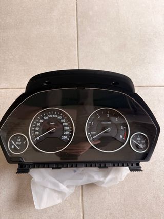 Cuadro de instrumentos para BMW F30. Incluye velocímetro, tacómetro y medidores de combustible y temperatura. - Velocímetro hasta 260 km/h. - Tacómetro hasta 6000 rpm. - Indicador de combustible (Diesel). - Indicador de temperatura del refrigerante. Buen estado. Se desinstaló funcionando perfectamente.