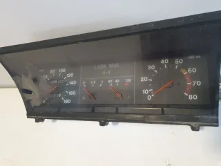 Cuadro de instrumentos para Lada Niva. Incluye velocímetro, tacómetro y medidor de temperatura. - Velocímetro hasta 180 km/h. - Tacómetro hasta 8000 rpm. - Medidor de temperatura. - Indicadores de carga de batería y presión de aceite. - Odómetro con 15626 km.