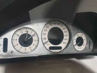 Cuadro de instrumentos para Mercedes Clase E. Muestra la velocidad, las revoluciones del motor y la temperatura. - Velocímetro hasta 260 km/h. - Tacómetro hasta 7000 rpm. - Indicador de temperatura exterior. - Indicador de nivel de combustible. - Reloj. - Indicadores de dirección.
