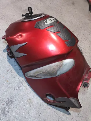 Depósito de gasolina para Kawasaki KLE 500. Color rojo metalizado con detalles en negro y plateado. - Esta oxidado por dentro - No tiene la llave de paso de gasolina - no tiene tapón ni llave - solo el depósito - Presenta algunos desperfectos y abolladuras, como se aprecia en las fotos.