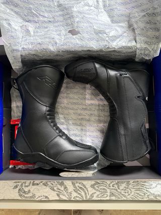 Botas de moto impermeables RST de cuero negro para mujer. Diseñadas para ofrecer protección y comodidad en la carretera. - Material exterior de cuero. - Cierre de cremallera. - Suela de goma antideslizante. - Detalle de protección en la puntera. - Completamente nuevas. - TALLA 36.