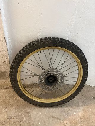Llanta dorada y neumático para Rieju RR. Rueda delantera, Ideal para proyectos de reparación o personalización. - Llanta de color dorado para reparar ya q esta doblada - Neumático Nuevo con apenas 2 meses de uso 49cc 50cc