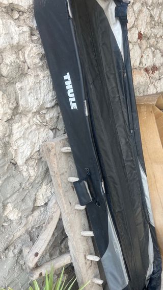 Cofre de techo de tela Thule Ranger 500- con bastante uso pero aún funcional y lo único las cremalleras cierran pero van duras, poco dinero el poder arreglar y solucionar ese tema. *Medidas: 1,90 cm de largo, 50cm de ancho y 30cm de altura *RECOGIDA EN MANO EN SITIO ACORDADO Trae separadores interiores de carga para organizar el material y los soporte de anclaje están perfectos, son de anclaje y liberación rápida muy sencillo a cualquier barra de techo o galería de techo de una furgoneta camper. perfecto para ampliar espacio de carga en una camper o transportar skies y todo tipo de carga -Material textil resistente al agua