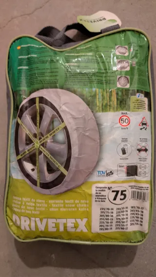 Cadenas textiles para nieve DRIVETEX talla 75. PARA Medidas de neumático: 235/70-14, 215/75-14, 205/80-14, 255/60-15, 225/70-15, 205/75-15, 195/80-15, 255/55-16, 235/60-16, 205/70-16, 175/80-16, 255/50-17, 235/55-17, 215/60-17, 185/70-17, 245/45-17, 255/45-18, 225/50-18, 235/50-18, 205/55-18 - Velocidad máxima recomendada: 50 km/h. - Certificación TÜV GS. Nunca usadas.