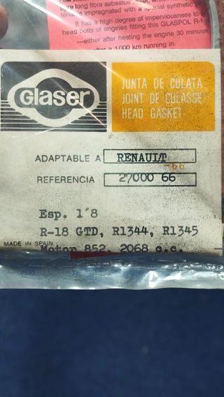 Junta de culata para Renault R18 modelos R1344 y R1345, motor 85s. 2068 CC. Ref: 2700 66 Más artículos en recambiosvehiculosclasicos.com R.V.C Se envía 622076323