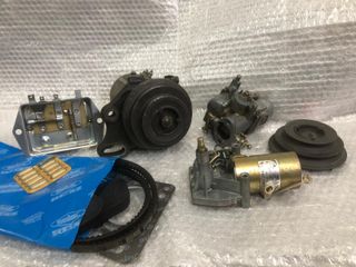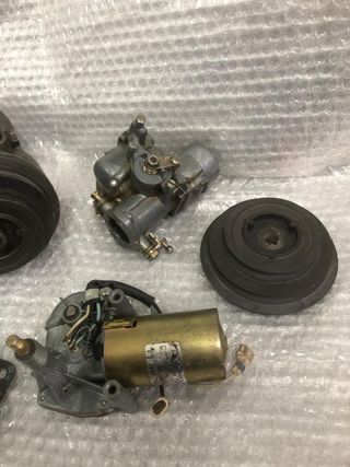 Lote de piezas y dinamo para Seat 600 E año aproximado 1972. - Dinamo y regulador original. - Polea de recambio. - Mecanismo de elevalunas. - Carburador. - Correas y junta de culata nueva. - Fusibles.