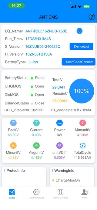 Batería de litio Molicel P42 con capacidad de 29Ah y voltaje de 60V. - Celdas Molicel P42A. - Configuración 16S6p - BMS Ant integrado de picos de 325AH,como podéis observar en la foto - Carcasa protectora. Apenas a sido utilizada como podeis ver en la foto los ciclos de carga y eso mas inf dm