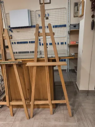 Se venden dos caballetes de madera, ideales para artistas o exposiciones. - Material: Madera. - Diseño robusto y estable.