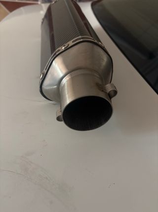 Silenciador de escape para moto o quad con acabado en fibra de carbono. - Diseño cónico. - Abrazaderas de sujeción incluidas. - Material: Fibra de carbono y metal.