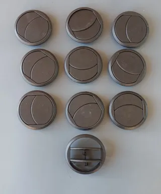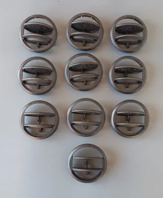 Lote de 10 rejillas redondas para deflector de aire. Son de color negro mate y diseño moderno. Como nuevas. - Diámetro exterior: 75mm. - Diámetro interior encastrable: 66mm - Material: Plástico. Precio del lote: 30€. Posibilidad de envío a cargo del comprador. Tags: Aire acondicionado aacc AA CC furgo furgoneta Camper caravana camión furgón ambulancia