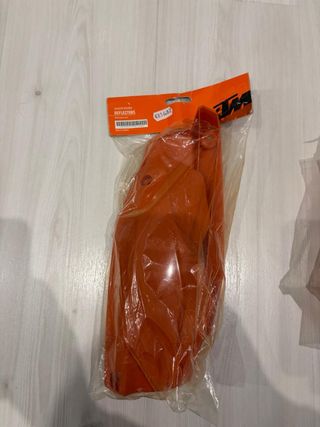 Deflectores de plástico naranja para moto KTM. Vienen en su embalaje original. Son para los paramanos de aluminio