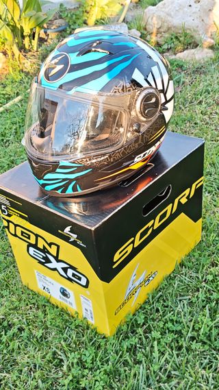 Casco Scorpion EXO talla xs con un diseño llamativo en negro, azul y blanco. Se encuentra en su caja original. - Diseño deportivo. - Talla XS. - Incluye caja original.