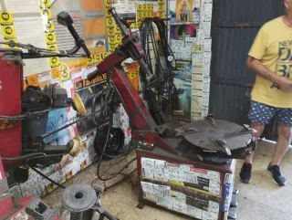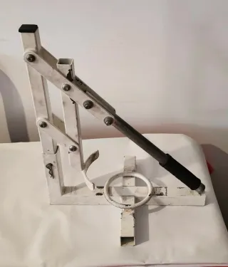 Equipo para desmontar neumáticos de moto. Incluye las patas para su soporte. - Estructura metálica robusta. - Color rojo y negro. - Usada en contadas ocasiones No hago envíos por razones obvias