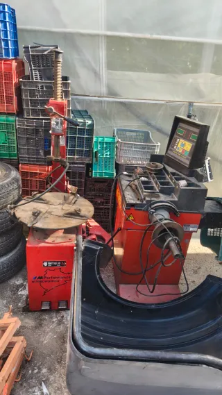 Equipo profesional para taller de neumáticos, incluye desmontadora y equilibradora. - Precio por máquina, 1200€ las dos. - Estructura robusta de color rojo. - Plato giratorio con garras de sujeción.