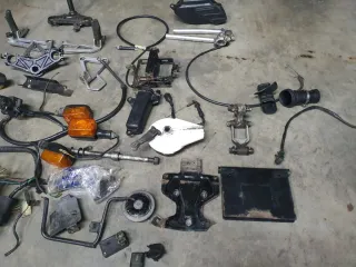 Iintermitentes delanteros, los que van en el carenado, luz posición del carenado, las 3 bien, sin roturas, gomas de suspensiones, 2 soportes para foco delantero, velocimetro,en esa caja de velocímetro hecha a mano entra la maquinaria del velocímetro original...ideal para sustituir los 2 relojes y dejar solo el velocímetro al hacer una café racer. Testigo sonoro intermitencia.