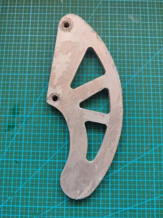 Protector de freno de disco trasero para Honda XR. Pieza de metal con un diseño curvo y huecos para sujeción. - Color grisáceo. - Forma curva. - Dos orificios para tornillos. Me la encontré en el campo, si la perdiste sabrás donde y te la devuelvo.