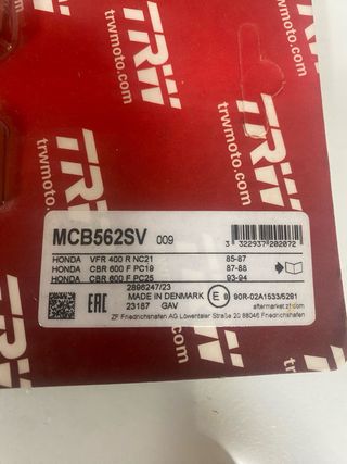 Pastillas de freno TRW MCB562SV. - Modelo: MCB562SV - Compatibles con Honda VFR 400R NC21, CBR 600 F PC19, CBR 600 F PS. - Fabricadas en Dinamarca. - para freno de disco delantero