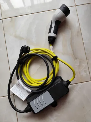 Cargador para coche eléctrico, compatible con BMW y con conector Tipo 2. - Cable de carga de 5 metros. - Indicadores LED de estado (Power, Charging, Temperature, Fault). - Enchufe Schuko para conexión a la red eléctrica. - Diseño portátil y robusto.