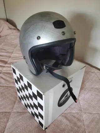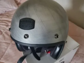 Modelo Astone Bellair Dirt Jet. Casco jet de estilo vintage en color plata. De fibra de vidrio y cierre de doble hebilla. Incluye visera. Valorado en 180€. Nuevo en su caja, nunca se ha usado.