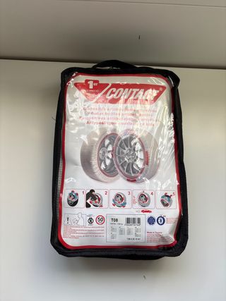 Tipo de Dispositivo: Fundas textiles antideslizantes para neumáticos. Marca y Modelo: Contact T08. Ventajas: Son fáciles de montar, ligeras, no producen vibraciones ni ruidos al conducir, y no dañan los neumáticos ni las llantas. Son lavables y reutilizables. Uso: Son ideales para un uso ocasional, como para ir de vacaciones a la montaña. Homologación: Están homologadas por ÖNORM V5121, lo que permite su uso en países donde se requiere este estándar.