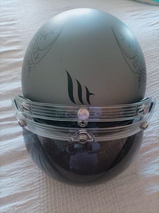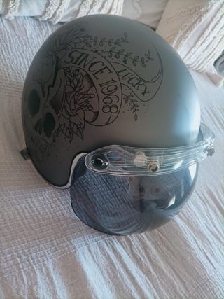 Casco de moto estilo vintage con un diseño único. - Dibujo de calavera y flores. - Inscripción Since 1968 Lucky. - Visera transparente incluida.