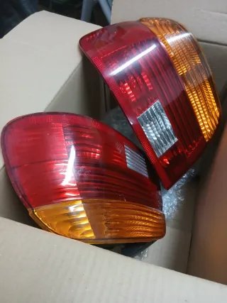 Conjunto de pilotos traseros para BMW serie 5 E39. Están en buen estado, sin roces. - Diseño rojo y ámbar. - Piezas de repuesto para el vehículo.
